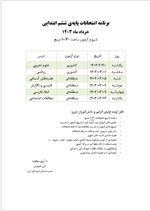 برنامه امتحانات نوبت دوم پایه ششم از آنی مانوکیان در چهارشنبه، 26 اردیبهشت 1403، 12:45 صبح Number of replies: 0 پیوند مستقیم