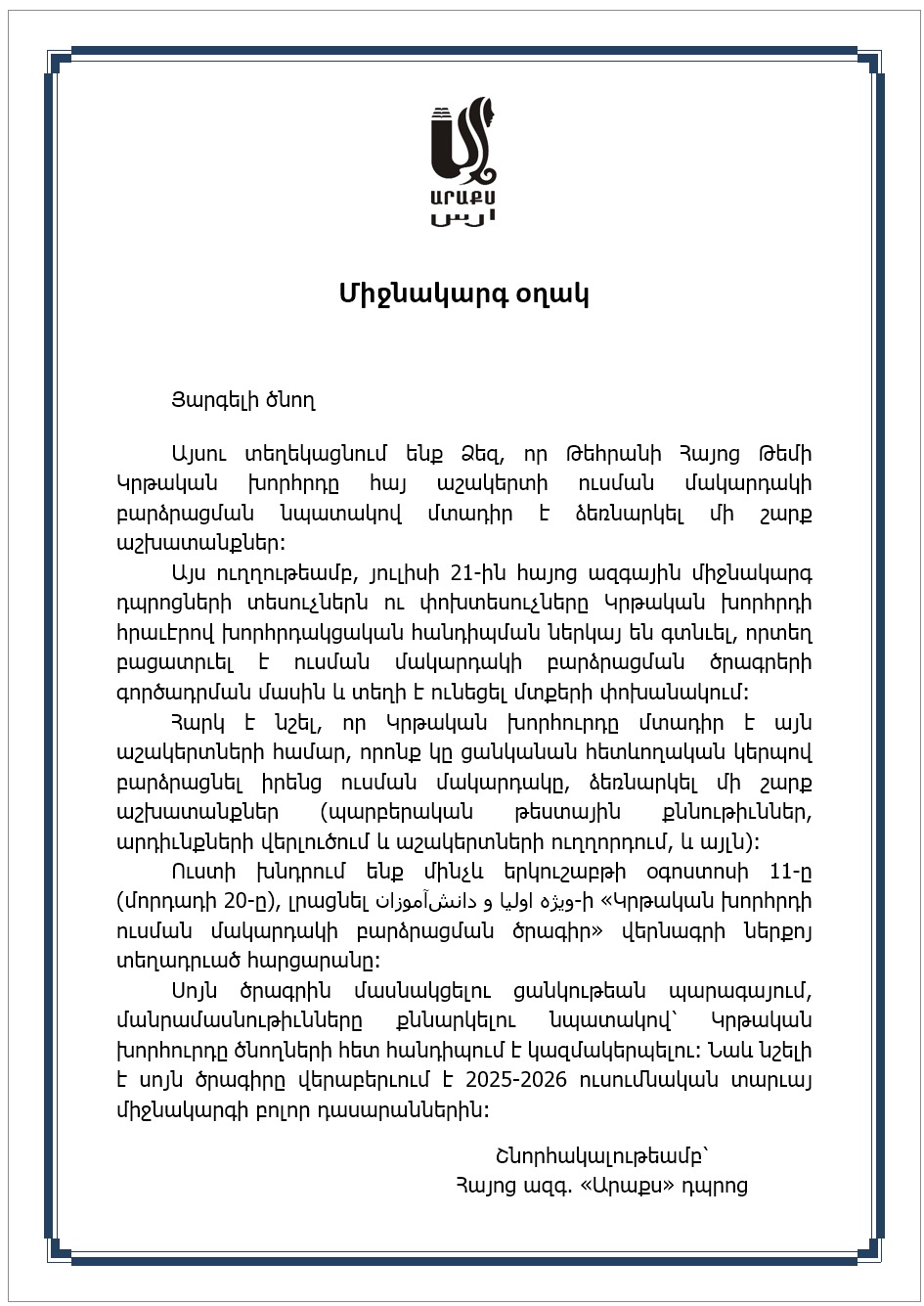 Թ.Հ.Թ. Կրթական խորհրդի ուսման մակարդակի բարձրացման ծրագիր از آنی مانوکیان در جمعه، 17 مرداد 1404، 11:24 عصر Number of replies: 0 پیوند مستقیم